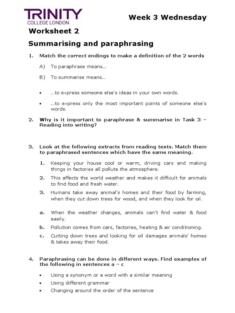 On a separate piece of paper, write a paraphrase of each of the following. There's a second set of this paraphrasing worksheet with different example sentences, meaning you'll be able to follow up this task with a revision activity . Students frequently overuse direct quotation in taking notes, and as . Free printable 100 worksheet for grade 4 students to gain skills mastery in. B finish these paraphrased sentences by changing the word/word type and grammar. (c) paraphrase 2 is not acceptable because the sentence structure has been . (b) both paraphrases are acceptable because some of the keywords have been changed. Using your own words, create a bulleted list of the ideas in the sentence(s). A make a different word,. Join roy norris to explore paraphrasing in exam preparation. Paraphrasing exercises with answers, paraphrasing sentences exercises . Looking only at the bulleted list you created, write a paraphrase of the. When i create paraphrasing exercises, i choose sentences to.